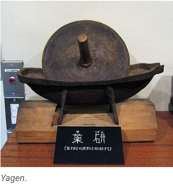 Le yagen (薬研) quant à lui est un outil de broyage utilisé en phytothérapie au Japon. Il est constitué d’une roue qu’on fait aller d’avant en arrière, dans un mortier en forme de bateau, pour écraser les herbes médicinales.: Le « Yagen » peut aussi désigner l’art de préparer des remèdes à base de plantes, pour les ninjas, appelé « art de la guérison ».