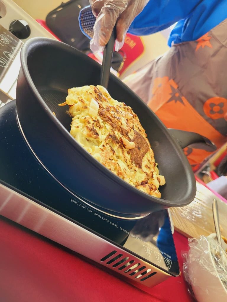 2) – « Préparation et dégustation de l’okonomiyaki »: si la majorité connaissait les sushis, beaucoup ont découvert avec un ravissement non feint l’okonomiyaki (お好み焼き), littéralement okonomi (お好み) qui signifie « ce que vous aimez / voulez » et yaki (焼き) qui signifie « grillé ». Une spécialité aux merveilleuses saveurs reconnues par les palais camerounais mais aussi avec de nouvelles qui ont aussi été fort appréciées. Entre la crêpe, la pizza et même l’omelette, l’okonomiyaki est composé d’une pâte sur laquelle sont disposés nombre d’ingrédients découpés en petits morceaux, le tout cuit sur une plaque chauffante, le teppan (鉄板), littéralement « plaque de fer ». Les gourmets n’ont pas pu départager les deux versions, sucrée ou salée, ils les ont toutes plébiscitées. Nous avons ainsi dégusté de délicieux sushis et okonomiyaki, cuisinés devant nous.