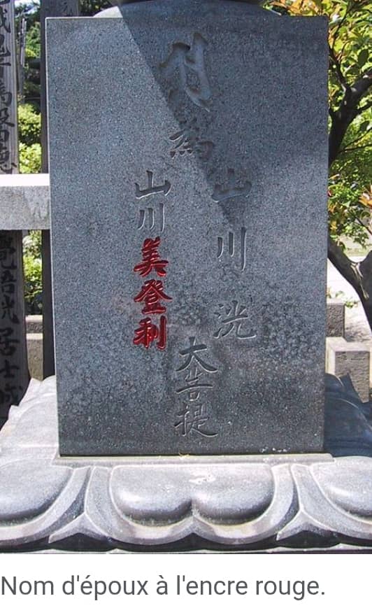 Le prêtre attribue aux fidèles pieux un « kaimyô » (戒 名), un nom bouddhiste et posthume, qui reflète personnalité ou la vie du défunt. Ce nom posthume est écrit sur une tablette commémorative en bois appelée « Ihai » (位牌), qui sert, dans les rituels bouddhistes, à honorer les défunts, écrit aussi sur la pierre tombale.